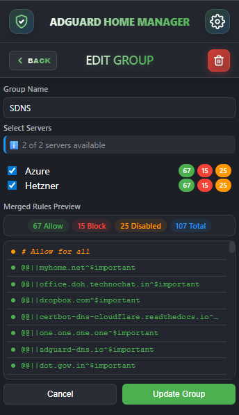 - One-Click Sync: Add a rule to the “Home” group, and it automatically syncs to every server in that group.