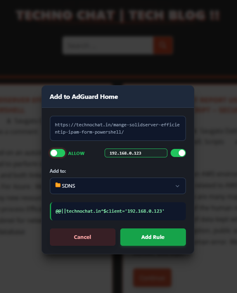 The extension simplifies AdGuard’s complex client syntax. Just toggle “Other Client”, enter the IP (192.168.1.50) or Client ID, and the extension automatically formats the rule as ||youtube.com^$client='192.168.1.50'.