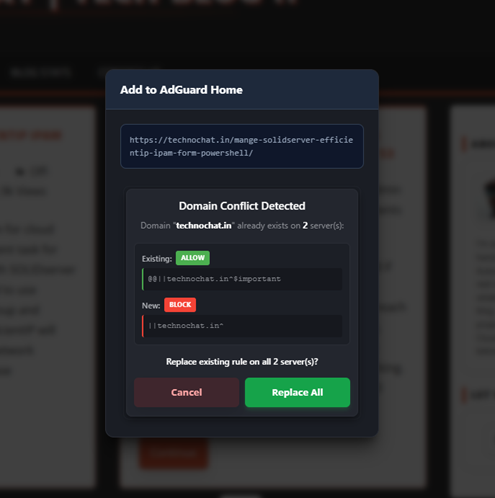 - Auto-Conflict Resolution: If you try to Block a domain that is already Allowed on a server, the extension warns you immediately.